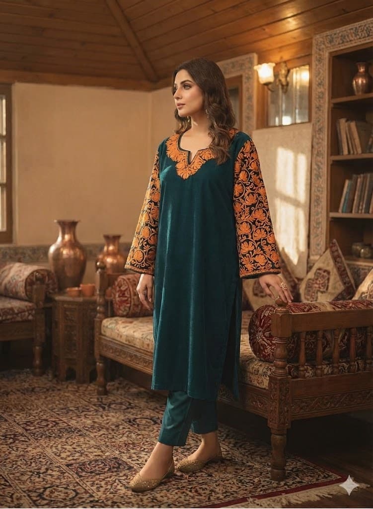 Heavier Aari work on neck and sleeves suitable for bridal wear.