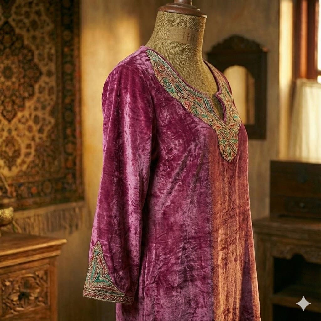 Subtle multi colour Tilla detailing on a neck and sleeves.